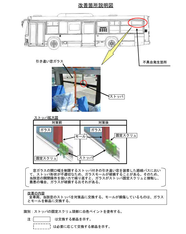 1.不具合の状況 窓ガラスの開口幅を制限するストッパ付きの引き違い窓を装着した路線バスにおいて、ストッパ形状が不適切なため、ガラスモールが破損することがあります。そのため、当該窓の開閉操作を強い力で繰り返すと、ガラスがストッパ固定スクリュと接触し、最悪の場合、ガラスが破損するおそれがあります。