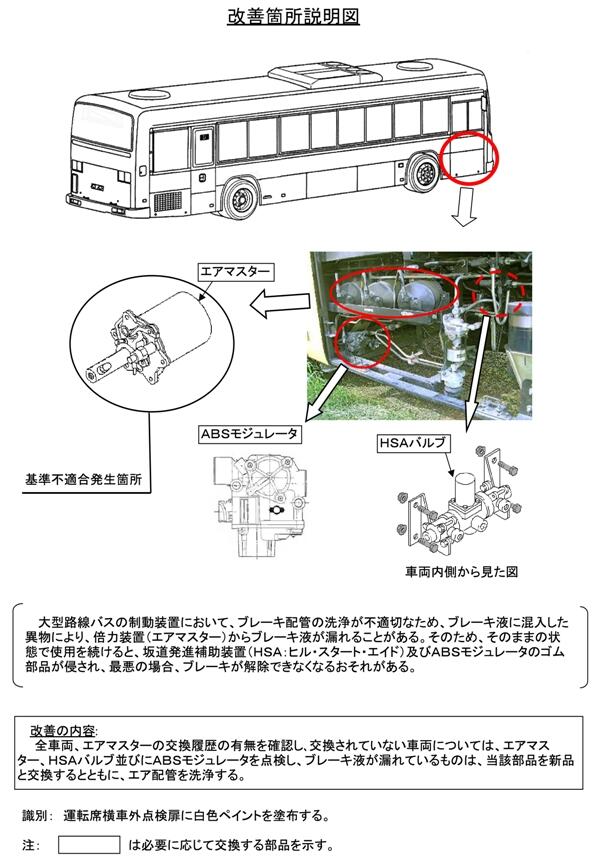 2.改善の内容 全車両、エアマスターの交換履歴の有無を確認し、交換されていない車両については、エアマスター、HSAバルブ並びにABSモジュレータを点検し、ブレーキ液が漏れているものは、当該部品を新品と交換するとともに、エア配管を洗浄します。