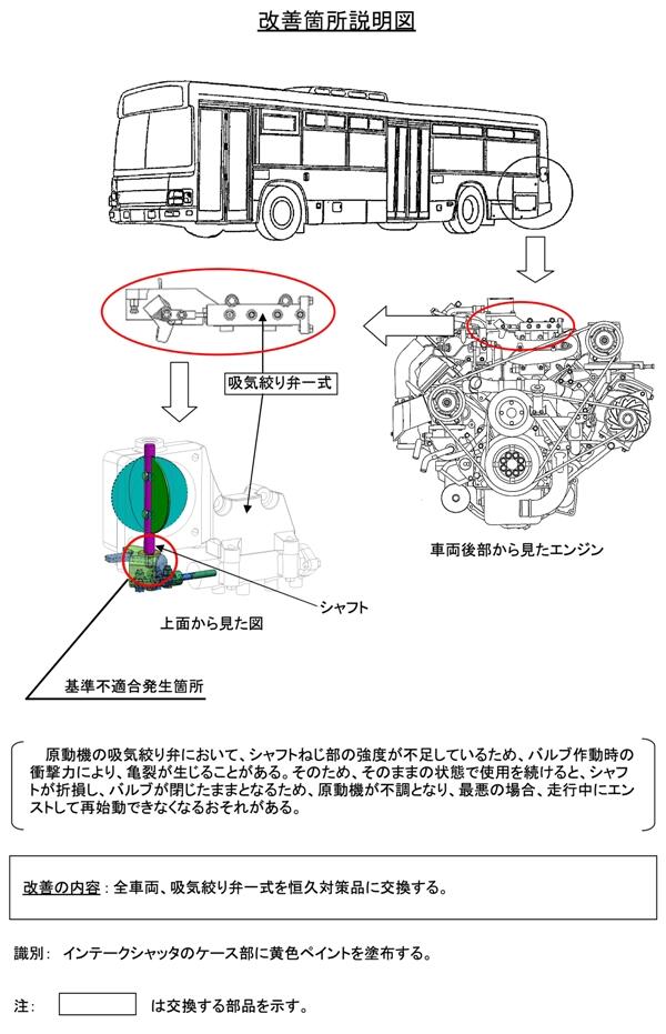 改善箇所説明図 3.対象車両 1)いすゞ自動車株式会社からOEM供給を受けている大型バスが対象となります。 2)商品名は、「日野ブルーリボンⅡ」です。 3)型式、車台番号の範囲、製作期間、対象台数は次の通りです。