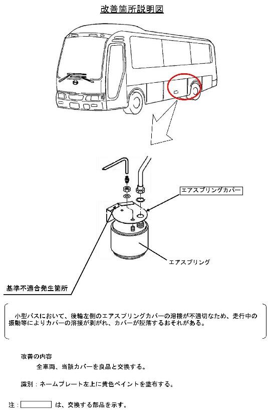 1.不具合の状況 小型バスにおいて、後輪左側のエアスプリングカバーの溶接が不適切なため、走行中の振動等によりカバーの溶接が剥がれ、カバーが脱落するおそれがあります。