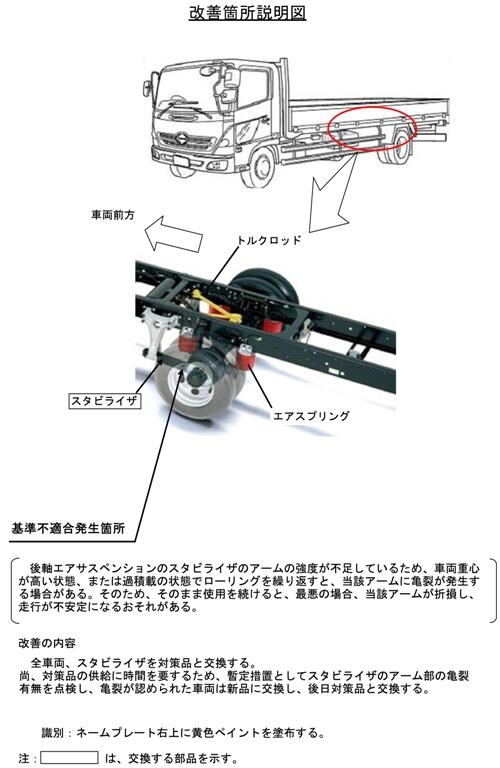 1.不具合の状況 後軸エアサスペンションのスタビライザのアームの強度が不足しているため、車両重心が高い状態、または過積載の状態でローリングを繰り返すと、当該アームに亀裂が発生する場合があります。そのため、そのまま使用を続けると、最悪の場合、当該アームが折損し、走行が不安定になるおそれがあります。