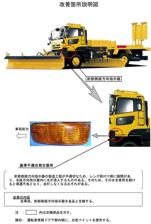 改善箇所説明図 3.対象車両 1)UDトラックス株式会社からOEM供給を受けている除雪車が対象となります。 2)型式、車台番号の範囲、製作期間、対象台数は次の通りです。
