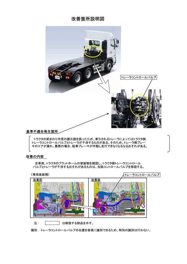 1.不具合の状況 トラクタの前まわり半径の諸元値を誤ったため、牽引されるトレーラによってはトラクタ側トレーラコントロールバルブとトレーラが干渉するものがあります。そのため、トレーラ側ブレーキのエアが漏れ、最悪の場合、駐車ブレーキが作動し走行できなくなるおそれがあります。