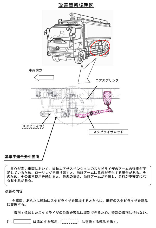 2.改善の内容 全車両、あらたに後軸にスタビライザを追加するとともに、既存のスタビライザを新品に交換します。