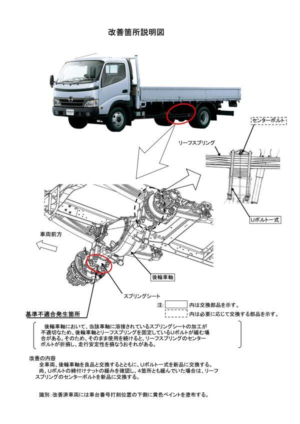 2.改善の内容 全車両、後輪車軸を良品と交換するとともに、Uボルト一式を新品に交換します。尚、Uボルトの締付けナットの緩みを確認し、4箇所とも緩んでいた場合は、リーフスプリングのセンターボルトを新品に交換します。