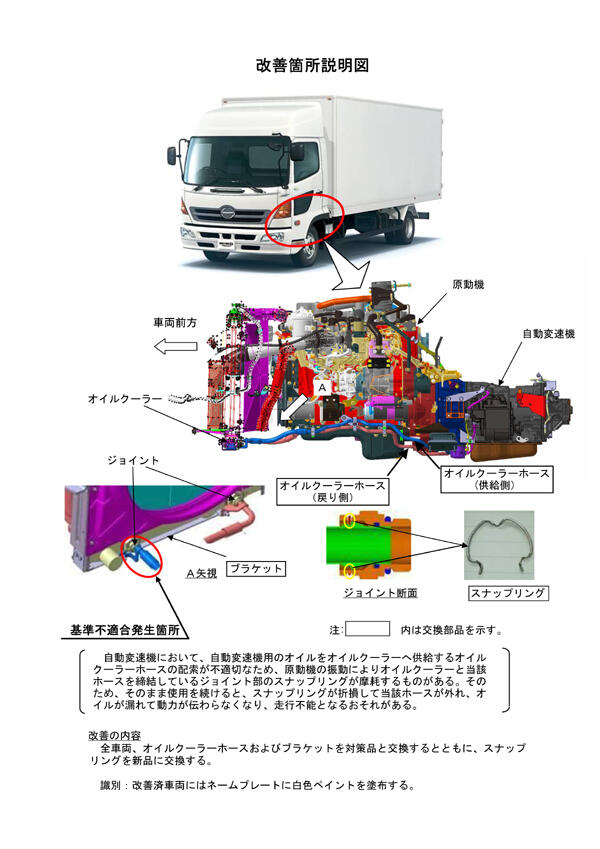 2.改善の内容 全車両、オイルクーラーホースおよびブラケットを対策品と交換するとともに、スナップリングを新品に交換します。
