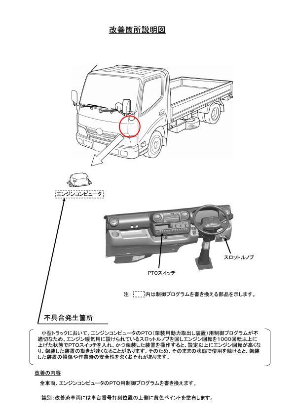 1.不具合の状況 小型トラックにおいて、エンジンコンピュータのPTO(架装用動力取出し装置)用制御プログラムが不適切なため、エンジン暖気用に設けられているスロットルノブを回しエンジン回転を1000回転以上に上げた状態でPTOスイッチを入れ、かつ架装した装置を操作すると、設定以上にエンジン回転が高くなり、架装した装置の動きが速くなることがあります。そのため、そのままの状態で使用を続けると、架装した装置の損傷や作業時の安全性を欠くおそれがあります。