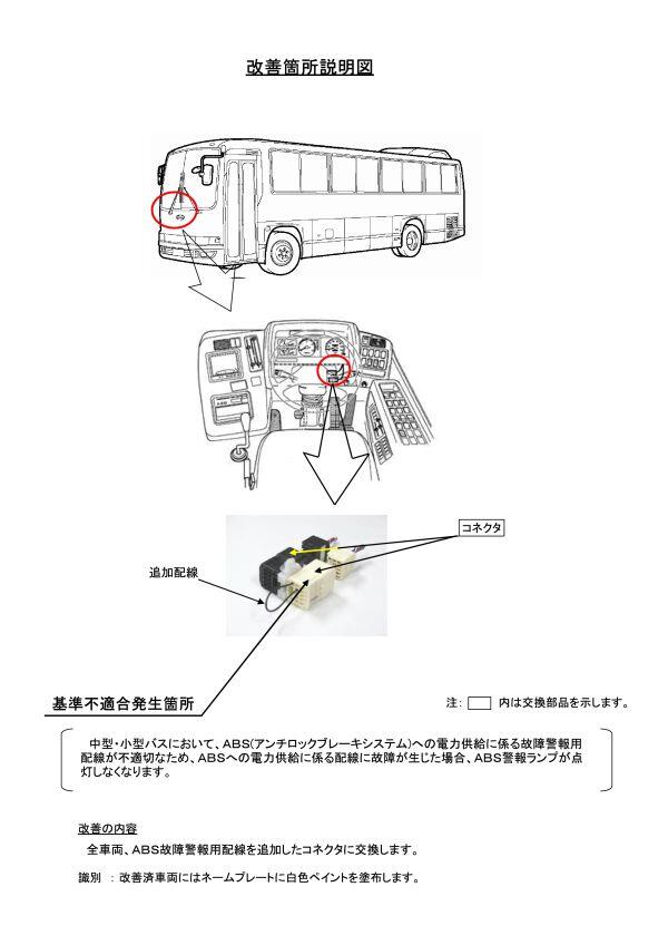 1.不具合の状況 中型・小型バスにおいて、ABS(アンチロックブレーキシステム)への電力供給に係る故障警報用配線が不適切なため、ABSへの電力供給に係る配線に故障が生じた場合、ABS警報ランプが点灯しなくなります。