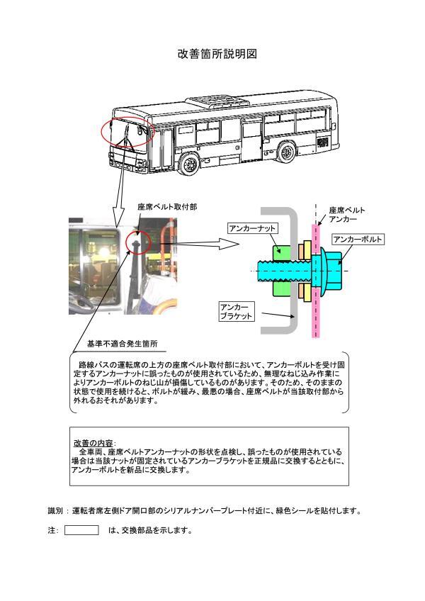 2.改善の内容 全車両、座席ベルトアンカーナットの形状を点検し、誤ったものが使用されている場合は当該ナットが固定されているアンカーブラケットを正規品に交換するとともに、アンカーボルトを新品に交換します。