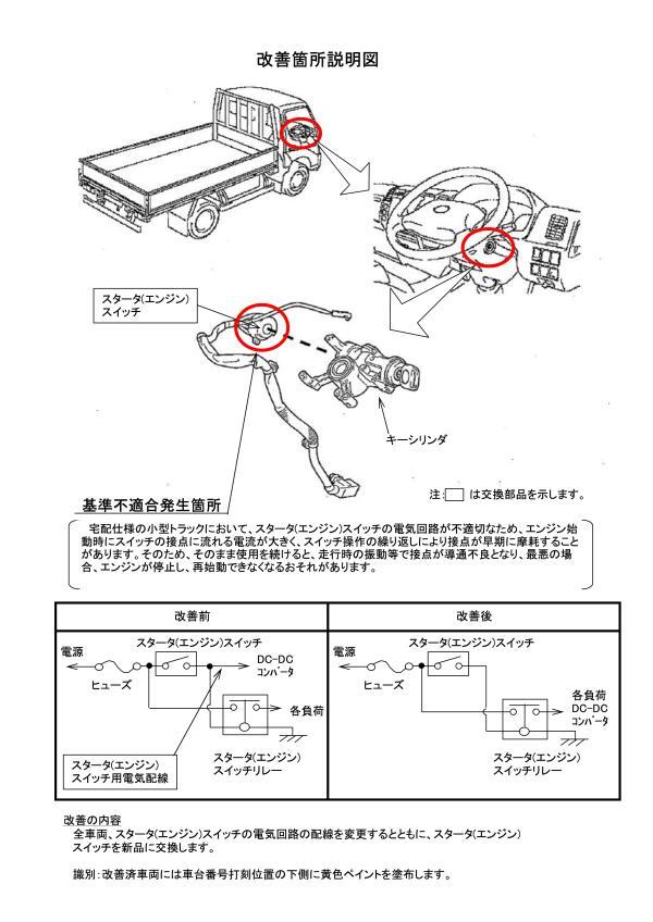 2.改善の内容 全車両、スタータ(エンジン)スイッチの電気回路の配線を変更するとともに、スタータ(エンジン)スイッチを新品に交換します。