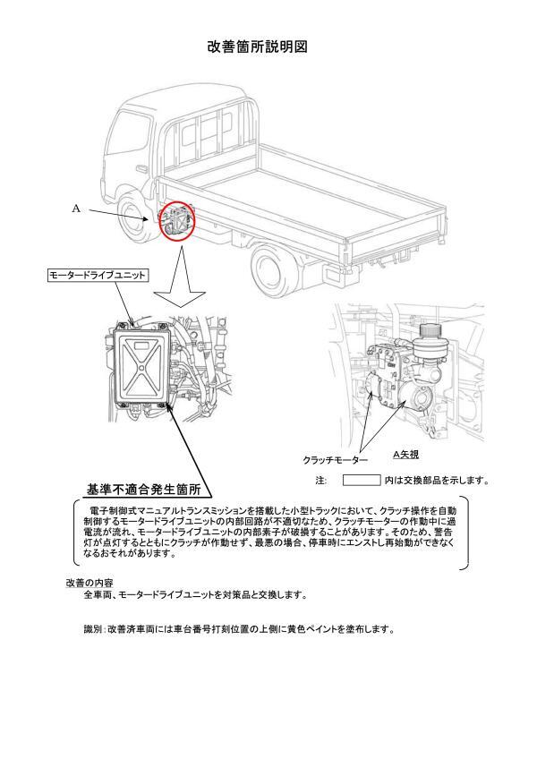1.不具合の状況 電子制御式マニュアルトランスミッションを搭載した小型トラックにおいて、クラッチ操作を自動制御するモータードライブユニットの内部回路が不適切なため、クラッチモーターの作動中に過電流が流れ、モータードライブユニットの内部素子が破損することがあります。そのため、警告灯が点灯するとともにクラッチが作動せず、最悪の場合、停車時にエンストし再始動ができなくなるおそれがあります。