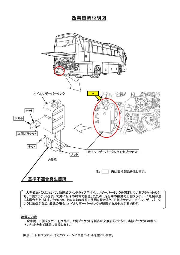 1.不具合の状況 大型観光バスにおいて、油圧式ファンドライブ用オイルリザーバータンクを固定しているブラケットのうち、下側ブラケットを誤って薄い板厚の材料で製造したため、走行中の振動で上側ブラケットに亀裂が生じる場合があります。そのため、そのままの状態で使用を続けると、下側ブラケット、オイルリザーバータンクに亀裂が生じ、最悪の場合、オイルリザーバータンクが脱落するおそれがあります。