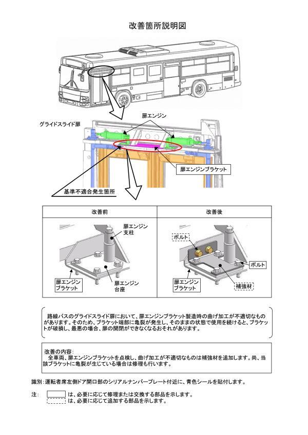 2.改善の内容 全車両、扉エンジンブラケットを点検し、曲げ加工が不適切なものは補強材を追加します。尚、当該ブラケットに亀裂が生じている場合は修理も行います。
