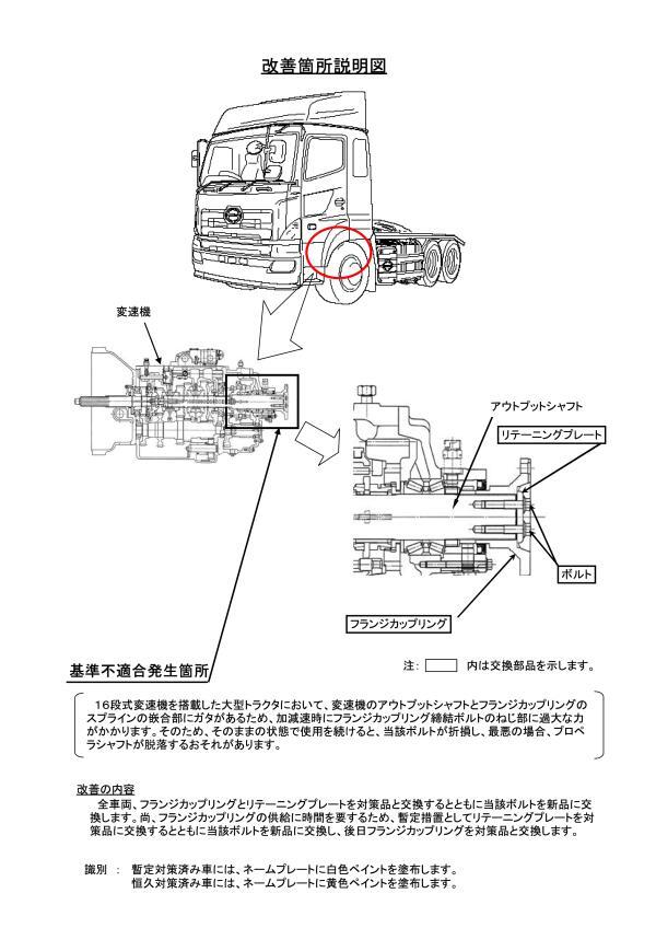 <ご注意> 1. 車台番号の範囲には対象とならない車両もありますので、詳しくは最寄りの日野販売会社にお問い合わせください。 2. 対象車の製作期間はご購入の時期とは異なります。 ------------------------------------------------------------------------------------ お問い合わせ先: 日野自動車株式会社 お客様相談窓口 フリーダイヤル 0120-10-6558 オープン時間:月曜~金曜(除く祝祭日)9:00~12:00, 13:00~17:00