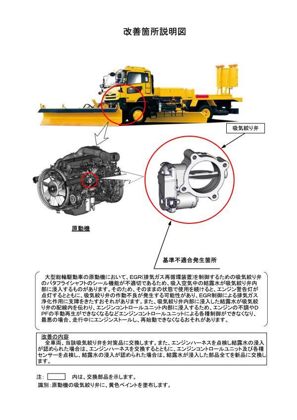2.改善の内容 全車両、当該吸気絞り弁を対策品に交換します。また、エンジンハーネスを点検し結露水の浸入が認められた場合は、エンジンハーネスを交換するとともに、エンジンコントロールユニット及び各種センサーを点検し、結露水の浸入が認められた場合は、結露水が浸入した部品全てを新品に交換します。