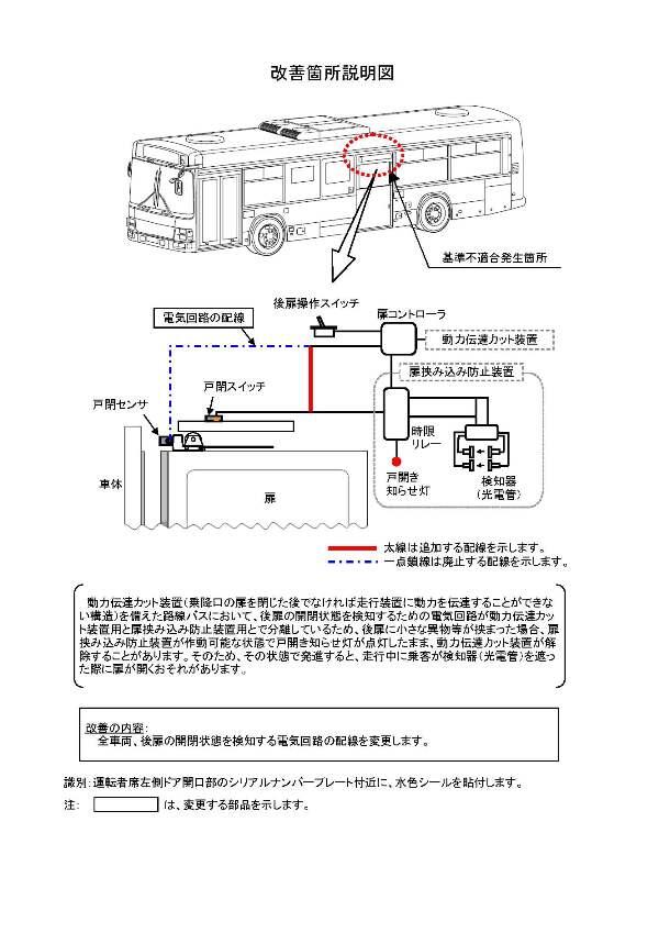 1.不具合の状況 動力伝達カット装置(乗降口の扉を閉じた後でなければ走行装置に動力を伝達することができない構造)を備えた路線バスにおいて、後扉の開閉状態を検知するための電気回路が動力伝達カット装置用と扉挟み込み防止装置用とで分離しているため、後扉に小さな異物等が挟まった場合、扉挟み込み防止装置が作動可能な状態で戸開き知らせ灯が点灯したまま、動力伝達カット装置が解除することがあります。そのため、その状態で発進すると、走行中に乗客が検知器(光電管)を遮った際に扉が開くおそれがあります。