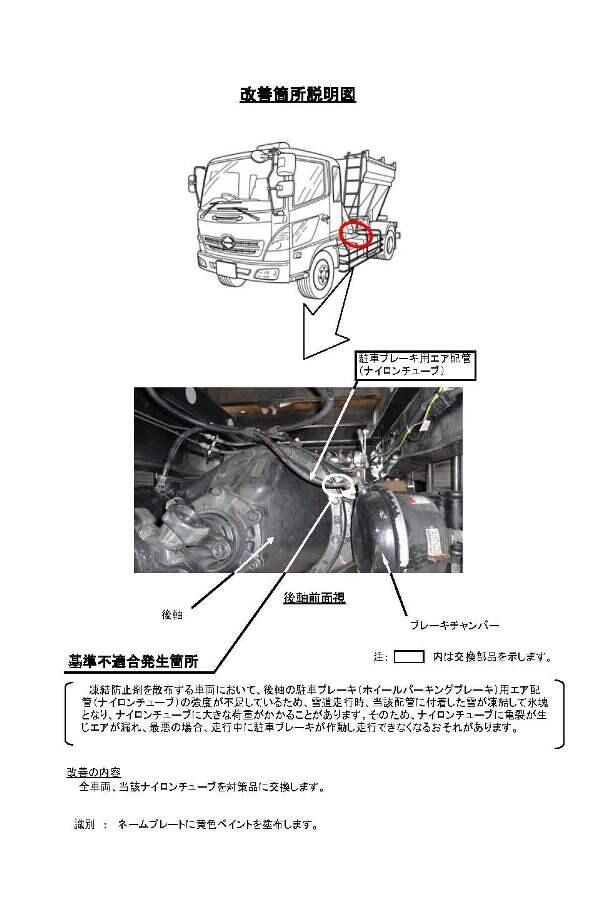 1.不具合の状況 凍結防止剤を散布する車両において、後軸の駐車ブレーキ(ホイールパーキングブレーキ)用エア配管(ナイロンチューブ)の強度が不足しているため、雪道走行時、当該配管に付着した雪が凍結して氷塊となり、ナイロンチューブに大きな荷重がかかることがあります。そのため、ナイロンチューブに亀裂が生じエアが漏れ、最悪の場合、走行中に駐車ブレーキが作動し走行できなくなるおそれがあります。