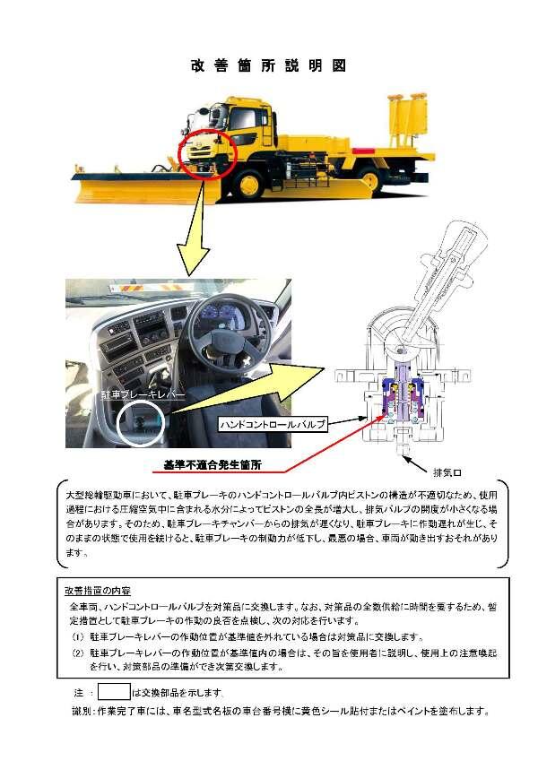 2.改善の内容 全車両、ハンドコントロールバルブを対策品に交換します。なお、対策品の全数供給に時間を要するため、暫定措置として駐車ブレーキの作動の良否を点検し、次の対応を行います。 (1)駐車ブレーキレバーの作動位置が基準値を外れている場合は対策品に交換します。 (2)駐車ブレーキレバーの作動位置が基準値内の場合は、その旨を使用者に説明し、使用上の注意喚起を行い、対策部品の準備ができ次第交換します。 改善箇所説明図