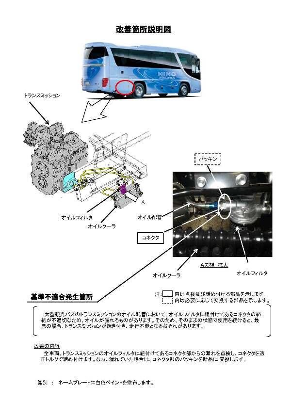 1.不具合の状況 大型観光バスのトランスミッションのオイル配管において、オイルフィルタに組付けてあるコネクタの締結が不適切なため、オイルが漏れるものがあります。そのため、そのままの状態で使用を続けると、最悪の場合、トランスミッションが焼き付き、走行不能となるおそれがあります。