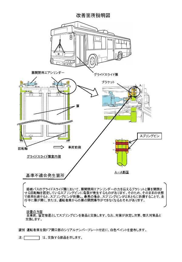 1.不具合の状況 路線バスのグライドスライド扉において、扉開閉用エアシリンダーの力を伝えるブラケットと扉を開閉させる回転軸を固定しているスプリングピンに亀裂が発生するものがあります。そのため、そのままの状態で使用を続けると、スプリングピンが折損し、最悪の場合、スプリングピンが2本ともに折損することで、走行中に扉が開く、または、運転者席からの扉の開閉操作ができなくなるおそれがあります。
