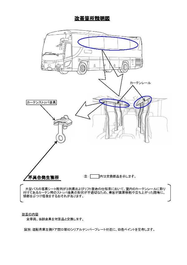 1.不具合の状況 大型バスの客席シート配列が3列席およびリフト装着の仕様車において、室内のカーテンレールに取り付けてあるカーテン用のストッパ金具の形状が不適切なため、乗客が座席移動や立ち上がった際等に、頭部をぶつけ怪我をするおそれがあります。