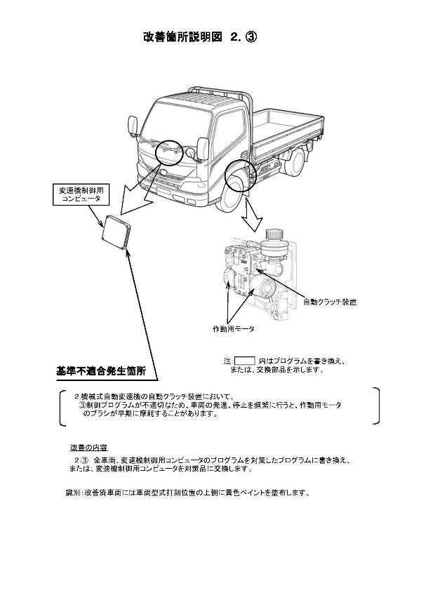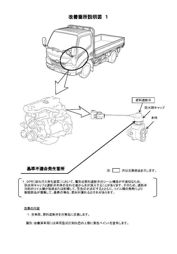 2.改善の内容 1.全車両、燃料遮断弁を対策品に交換します。 2.①及び② 全車両、作動用モータを対策品に交換します。 2.③ 全車両、変速機制御用コンピュータのプログラムを対策したプログラムに書き換え、または、変速機制御用コンピュータを対策品に交換します。 3.全車両、助手席側後写鏡を対策品に交換します。