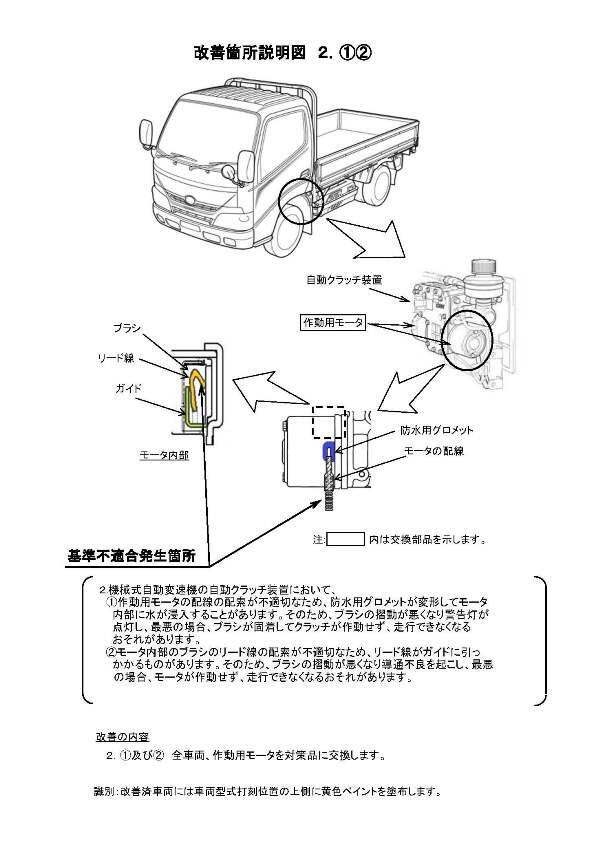 1.不具合の状況 1.DPR(排出ガス浄化装置)において、電気式燃料遮断弁のシール構造が不適切なため、防水用キャップと遮断弁本体の合わせ面から水が浸入することがあります。そのため、遮断弁内部のコイル線が短絡または断線して、警告灯が点灯するとともに、コイル線の発熱により樹脂部品が損傷して、最悪の場合、燃料が漏れるおそれがあります。 2.機械式自動変速機の自動クラッチ装置において、 ①作動用モータの配線の配索が不適切なため、防水用グロメットが変形してモータ内部に水が浸入することがあります。そのため、ブラシの摺動が悪くなり警告灯が点灯し、最悪の場合、ブラシが固着してクラッチが作動せず、走行できなくなるおそれがあります。 ②モータ内部のブラシのリード線の配索が不適切なため、リード線がガイドに引っかかるものがあります。そのため、ブラシの摺動が悪くなり導通不良を起こし、最悪の場合、モータが作動せず、走行できなくなるおそれがあります。 ③制御プログラムが不適切なため、車両の発進、停止を頻繁に行うと、作動用モータのブラシが早期に摩耗することがあります。 3.ルートバンの助手席側手動鏡面調整式の後写鏡において、鏡面と本体の固定方法が不適切なため、走行振動等により鏡面と本体の嵌合爪が摩耗することがあります。そのため、そのままの状態で使用を続けると、嵌合爪が折損し、最悪の場合、鏡面が脱落して、後方の交通状況等が確認できないおそれがあります。