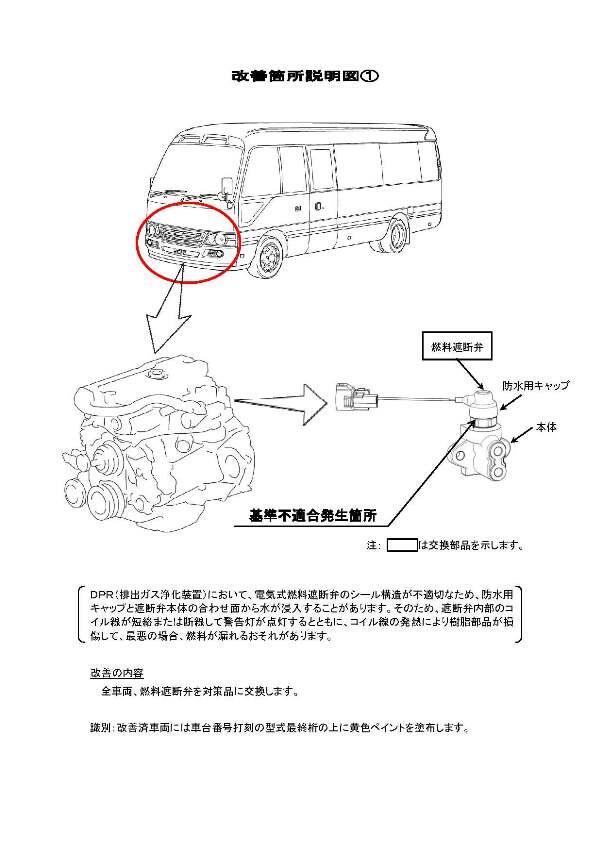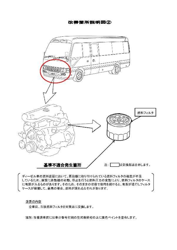 2.改善の内容 ①全車両、燃料遮断弁を対策品に交換します。 ②全車両、当該燃料フィルタを対策品に交換します。