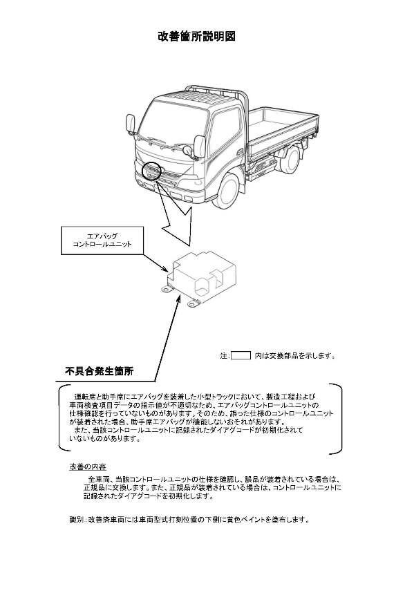 1.不具合の状況 運転席と助手席にエアバッグを装着した小型トラックにおいて、製造工程および車両検査項目データの指示値が不適切なため、エアバッグコントロールユニットの仕様確認を行っていないものがあります。そのため、誤った仕様のコントロールユニットが装着された場合、助手席エアバッグが機能しないおそれがあります。 また、当該コントロールユニットに記録されたダイアグコードが初期化されていないものがあります。