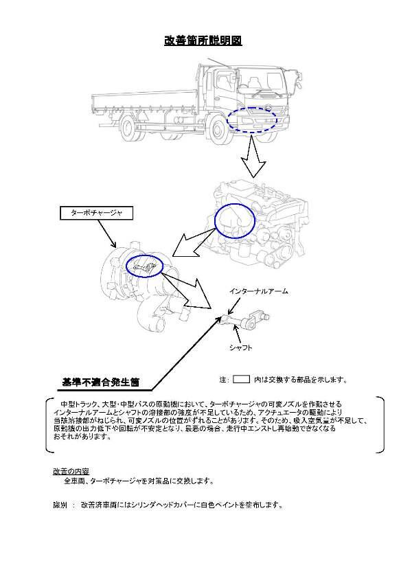1.不具合の状況 中型トラック、大型・中型バスの原動機において、ターボチャージャの可変ノズルを作動させるインターナルアームとシャフトの溶接部の強度が不足しているため、アクチュエータの駆動により当該溶接部がねじられ、可変ノズルの位置がずれることがあります。そのため、吸入空気量が不足して、原動機の出力低下や回転が不安定となり、最悪の場合、走行中エンストし再始動できなくなるおそれがあります。