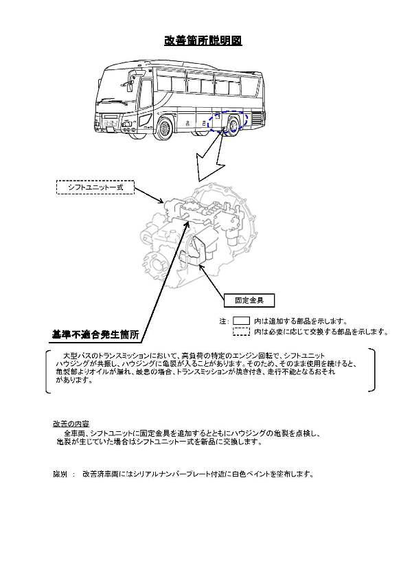 1.不具合の状況 大型バスのトランスミッションにおいて、高負荷の特定のエンジン回転で、シフトユニットハウジングが共振し、ハウジングに亀裂が入ることがあります。そのため、そのまま使用を続けると、亀裂部よりオイルが漏れ、最悪の場合、トランスミッションが焼き付き、走行不能となるおそれがあります。