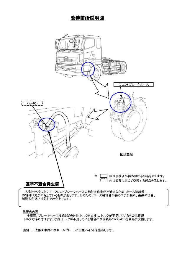 2.改善の内容 全車両、ブレーキホース接続部の締付けトルクを点検し、トルクが不足しているものは正規トルクで締め付けます。なお、トルクが不足している場合には接続部のパッキンを新品に交換します。