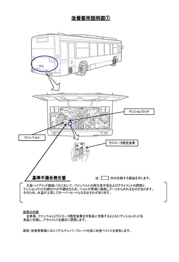 1.不具合の状況 大型ハイブリッド路線バスにおいて、 ①ファンベルトの耐久性不足およびアライメントの調整とテンションロッドの締付けが不適切なため、ベルトが早期に摩耗しプーリから外れるものがあります。そのため、水温が上昇してオーバーヒートとなるおそれがあります。 ②ハイブリッドシステムの制御プログラムが不適切なため、低速で減速している状態で一定速度以下になった場合、エンスト防止機能が働きクラッチが切れますが、その後、モータ駆動に切り替わらず加速できないおそれがあります。