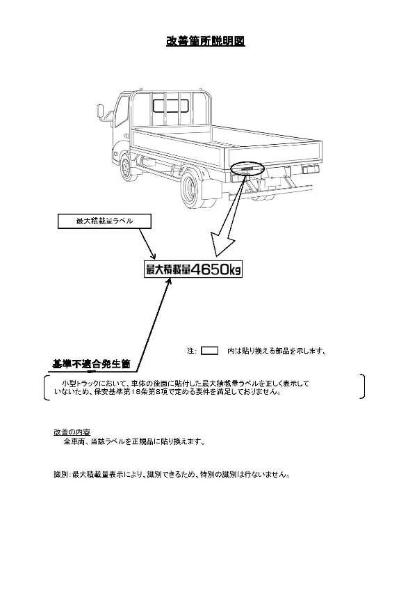 1.不具合の状況 小型トラックにおいて、車体の後面に貼付した最大積載量ラベルを正しく表示していないため、保安基準第18条第8項で定める要件を満足しておりません。