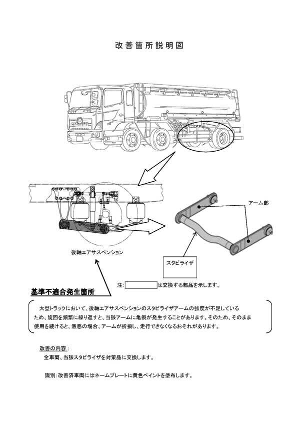 1.不具合の状況 大型トラックにおいて、後軸エアサスペンションのスタビライザアームの強度が不足しているため、旋回を頻繁に繰り返すと、当該アームに亀裂が発生することがあります。そのため、そのまま使用を続けると、最悪の場合、アームが折損し、走行できなくなるおそれがあります。