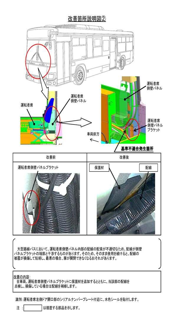 1.不具合の状況 ①大型・中型路線バスにおいて、運転者席下側配電箱と運転者席側壁パネルの接続部の端部の保護が不適切なため、当該端部と配線が干渉するものがあります。そのため、そのまま使用を続けると、配線の被覆が損傷して短絡し、最悪の場合、走行中にエンジンが停止し、再始動できなくなるおそれがあります。 ②大型路線バスにおいて、運転者席側壁パネル内部の配線の配索が不適切なため、配線が側壁パネルブラケットの端部と干渉するものがあります。そのため、そのまま使用を続けると、配線の被覆が損傷して短絡し、最悪の場合、扉が開閉できなくなるおそれがあります。