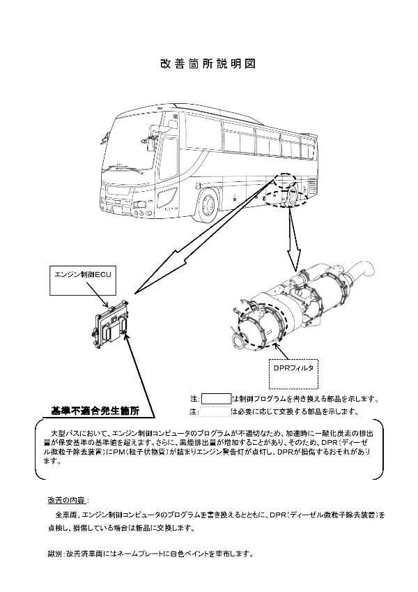 1.不具合の状況 大型バスにおいて、エンジン制御コンピュータのプログラムが不適切なため、加速時に一酸化炭素の排出量が保安基準の基準値を超えます。さらに、黒煙排出量が増加することがあり、そのため、DPR(ディーゼル微粒子除去装置)にPM(粒子状物質)が詰まりエンジン警告灯が点灯し、DPRが損傷するおそれがあります。