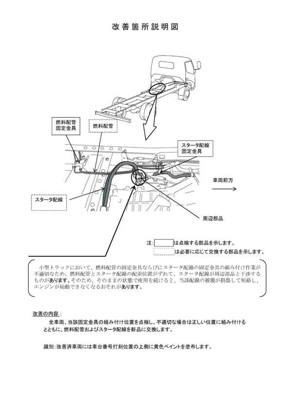 2.改善の内容 全車両、当該固定金具の組み付け位置を点検し、不適切な場合は正しい位置に組み付けるとともに、燃料配管およびスタータ配線を新品に交換します。