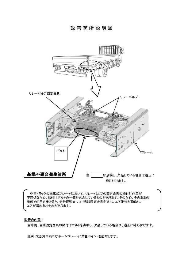 1.不具合の状況 中型トラックの空気式ブレーキにおいて、リレーバルブの固定金具の締付け作業が不適切なため、締付けボルトの一部が欠品しているものがあります。そのため、そのままの状態で使用を続けると、走行振動等により当該固定金具が外れ、エア配管が損傷し、エアが漏れるおそれがあります。