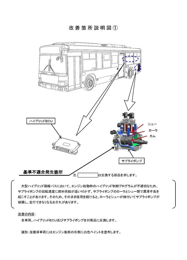 1.不具合の状況 大型ハイブリッド路線バスにおいて、 ①エンジン始動時のハイブリッド制御プログラムが不適切なため、サプライポンプの回転速度に燃料供給が追い付かず、サプライポンプのローラとシュー間で潤滑不良を起こすことがあります。そのため、そのまま使用を続けると、ローラとシューが焼付いてサプライポンプが破損し、走行できなくなるおそれがあります。 ②エンジンクランクプーリ上部にあるファンベルトの振止めローラを固定する金具の強度が不足しているため、エンジン振動により当該金具が共振して折損するものがあります。そのため、走行中に当該金具とローラが脱落するおそれがあります。 ③ファンベルトのプーリ間距離が不適切なため、ファンベルトが振れて早期にたわみ量が大きくなることがあります。そのため、そのままの状態で使用を続けると、ファンベルトが捩れて中央部で屈曲を繰り返すことで分断し外れ、オーバーヒートとなるおそれがあります。