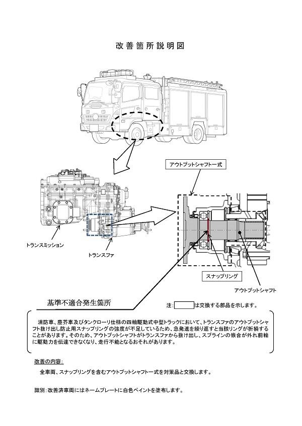 1.不具合の状況 消防車、塵芥車及びタンクローリ仕様の四輪駆動式中型トラックにおいて、トランスファのアウトプットシャフト抜け出し防止用スナップリングの強度が不足しているため、急発進を繰り返すと当該リングが折損することがあります。そのため、アウトプットシャフトがトランスファから抜け出し、スプラインの嵌合が外れ前輪に駆動力を伝達できなくなり、走行不能となるおそれがあります。