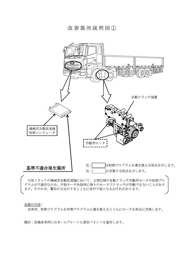 1.不具合の状況 ①大型トラックの機械式自動変速機において、2個仕様の自動クラッチ作動用モータの制御プログラムが不適切なため、片側モータ失陥時に残りのモータでクラッチが作動できないことがあります。そのため、警告灯が点灯するとともに走行不能となるおそれがあります。 ②大型トラックの機械式自動変速機において、変速用モータの強度検討が不足していたため、変速終了時に巻線かしめ部に過大な引っ張り力が加わり、変速が繰り返し行われると巻線が断線することがあります。そのため、警告灯が点灯するとともに変速できなくなり、走行不能となるおそれがあります。 ③大型トラックにおいて、車速センサ内部の熱膨張に対する検討が不足していたため、高温時に構成部品どうしが干渉することで素子ハンダ部に過大な力が加わることがあります。そのため、素子ハンダ部に亀裂が生じ、素子ハンダ部が導通不良となり、警告灯が点灯するとともに自動変速不良や速度計の指示不良となるおそれがあります。