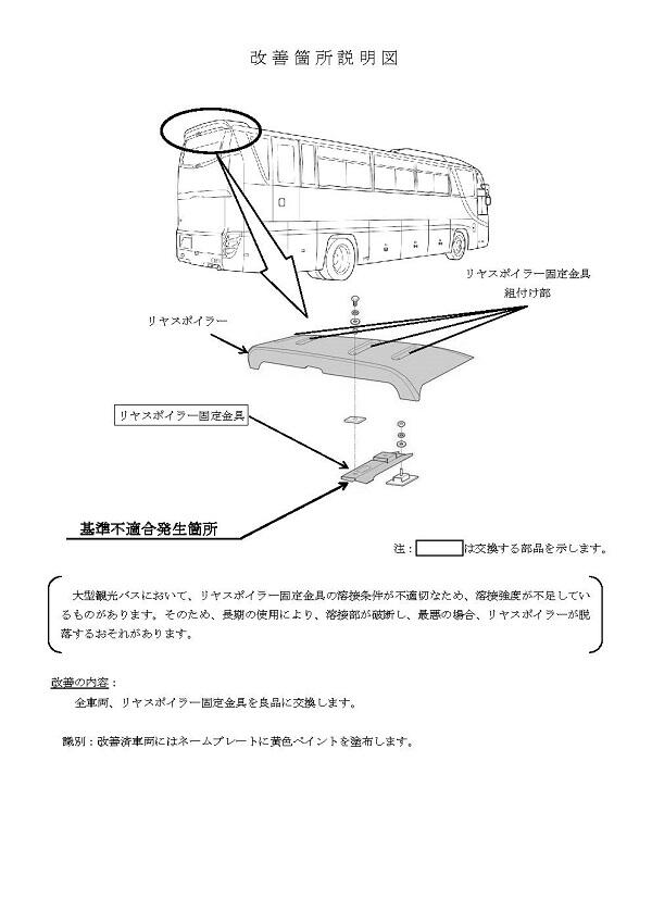 1.不具合の状況 大型観光バスにおいて、リヤスポイラー固定金具の溶接条件が不適切なため、溶接強度が不足しているものがあります。そのため、長期の使用により、溶接部が破断し、最悪の場合、リヤスポイラーが脱落するおそれがあります。