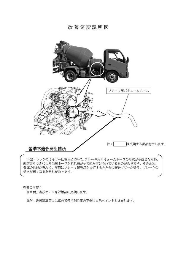 1.不具合の状況 小型トラックのミキサー仕様車において、ブレーキ用バキュームホースの形状が不適切なため、配索ばらつきにより当該ホースが折れ曲がって組み付けられているものがあります。そのため、負圧の供給が遅れて、早期にブレーキ警告灯が点灯するとともに警告ブザーが鳴り、ブレーキの効きが悪くなるおそれがあります。