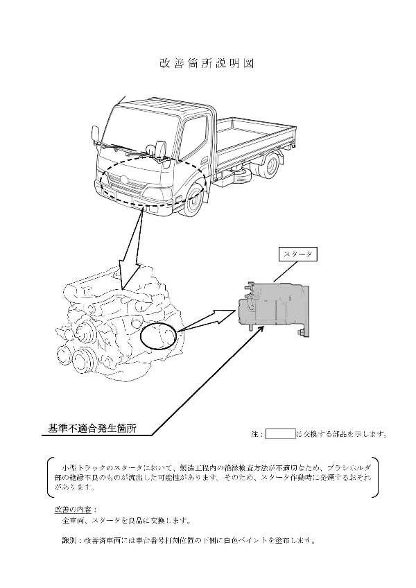 1.不具合の状況 小型トラックのスタータにおいて、製造工程内の絶縁検査方法が不適切なため、ブラシホルダ部の絶縁不良のものが流出した可能性があります。そのため、スタータ作動時に発煙するおそれがあります。