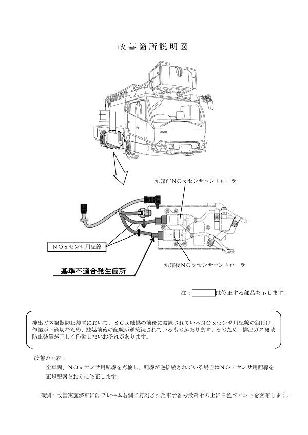 2.改善の内容 全車両、NOxセンサ用配線を点検し、配線が逆接続されている場合はNOxセンサ用配線を正規配索どおりに修正します。