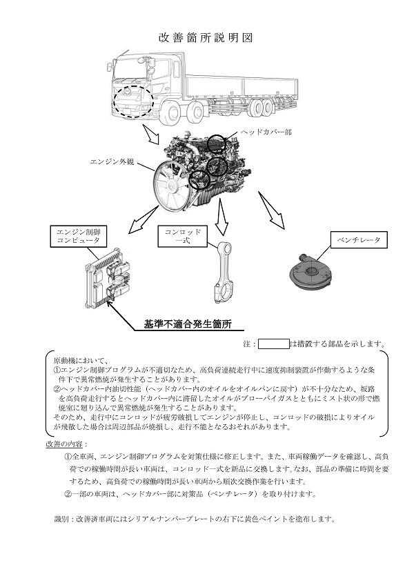2.改善の内容 ①全車両、エンジン制御プログラムを対策仕様に修正します。 また、車両稼働データを確認し、高負荷での稼働時間が長い車両は、コンロッド一式を新品に交換します。 なお、部品の準備に時間を要するため、高負荷での稼働時間が長い車両から順次交換作業を行います。 ②一部の車両は、ヘッドカバー部に対策品(ベンチレータ)を取り付けます。