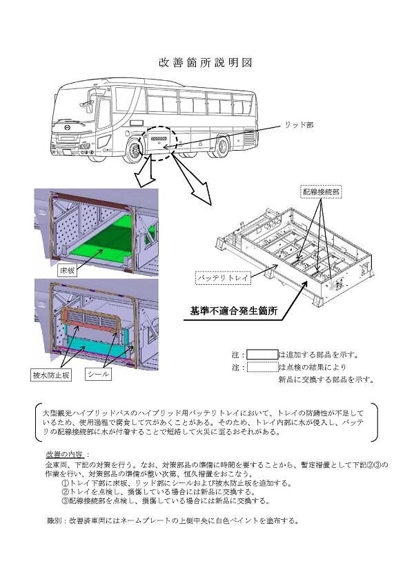 1.不具合の状況 大型観光ハイブリッドバスのハイブリッド用バッテリトレイにおいて、トレイの防錆性が不足しているため、使用過程で腐食して穴があくことがあります。そのため、トレイ内部に水が侵入し、バッテリの配線接続部に水が付着することで短絡して火災に至るおそれがあります。