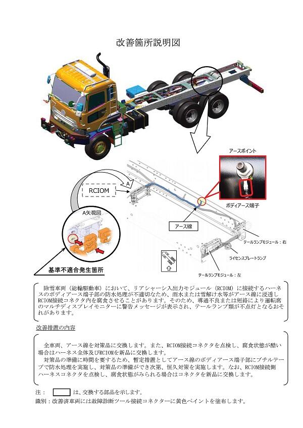 1.不具合の状況 除雪車両(総輪駆動車)において、リアシャーシ入出力モジュール(RCIOM)に接続するハーネスのボディアース端子部の防水処理が不適切なため、雨水または雪解け水等がアース線に浸透しRCIOM接続コネクタ内を腐食させることがあります。 そのため、導通不良または短絡により運転席のマルチディスプレイモニターに警告メッセージが表示され、テールランプ類が不点灯となるおそれがあります。