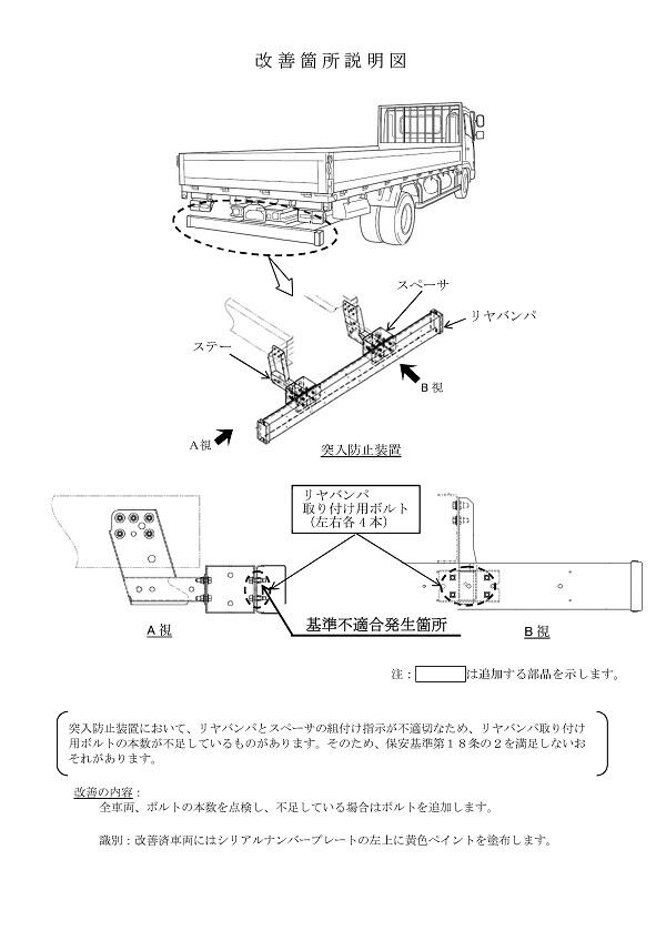 1.不具合の状況 突入防止装置において、リヤバンパとスペーサの組付け指示が不適切なため、リヤバンパ取り付け用ボルトの本数が不足しているものがあります。そのため、保安基準第18条の2を満足しないおそれがあります。